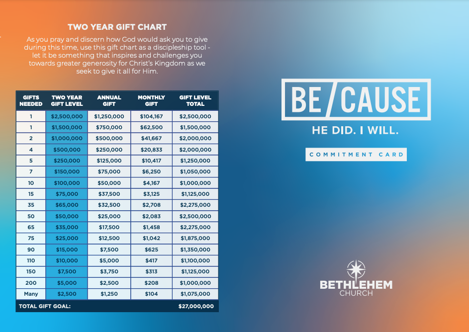 Bethlehem Church’s original goal for campaign commitments was $27 million, and they exceeded that goal by receiving over $31.5 million in giving pledges! This encouraged Bethlehem’s leadership team to set a new goal of $34 million as they continue to fundraise.