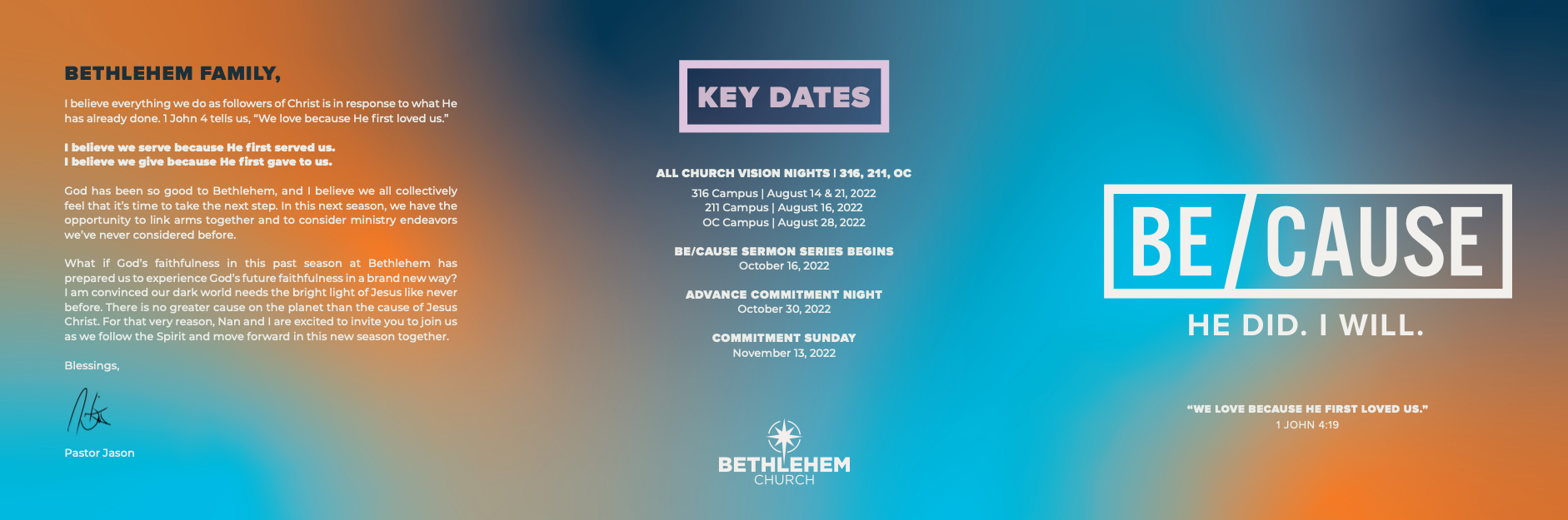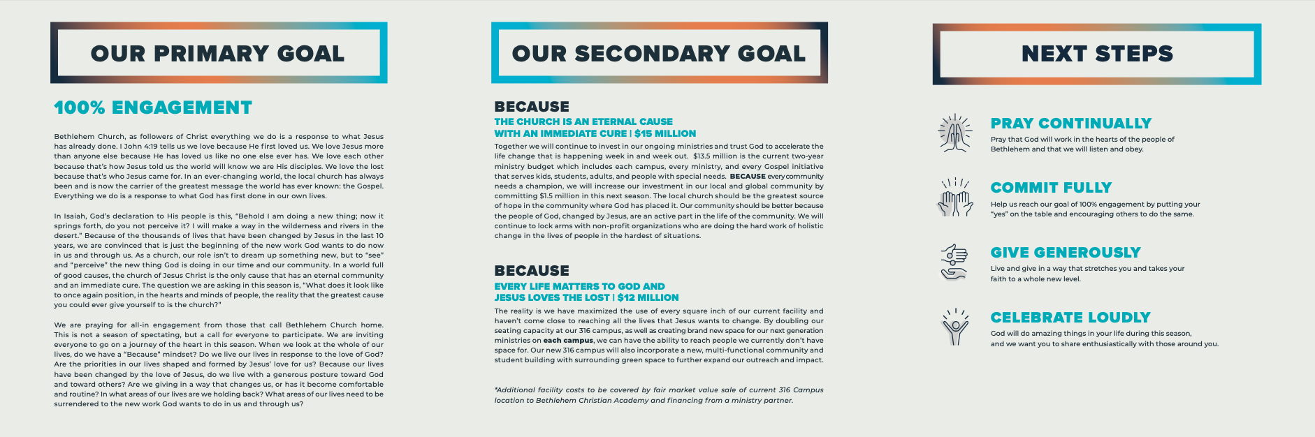 As talented as the Bethlehem Church staff is, they didn't have the margin to execute all of the assets needed to make a campaign like Be/Cause a success. So they turned to the Clever Marketing team for the assist. Clever’s creative team created the campaign brand, Vision Book, and campaign website landing page.