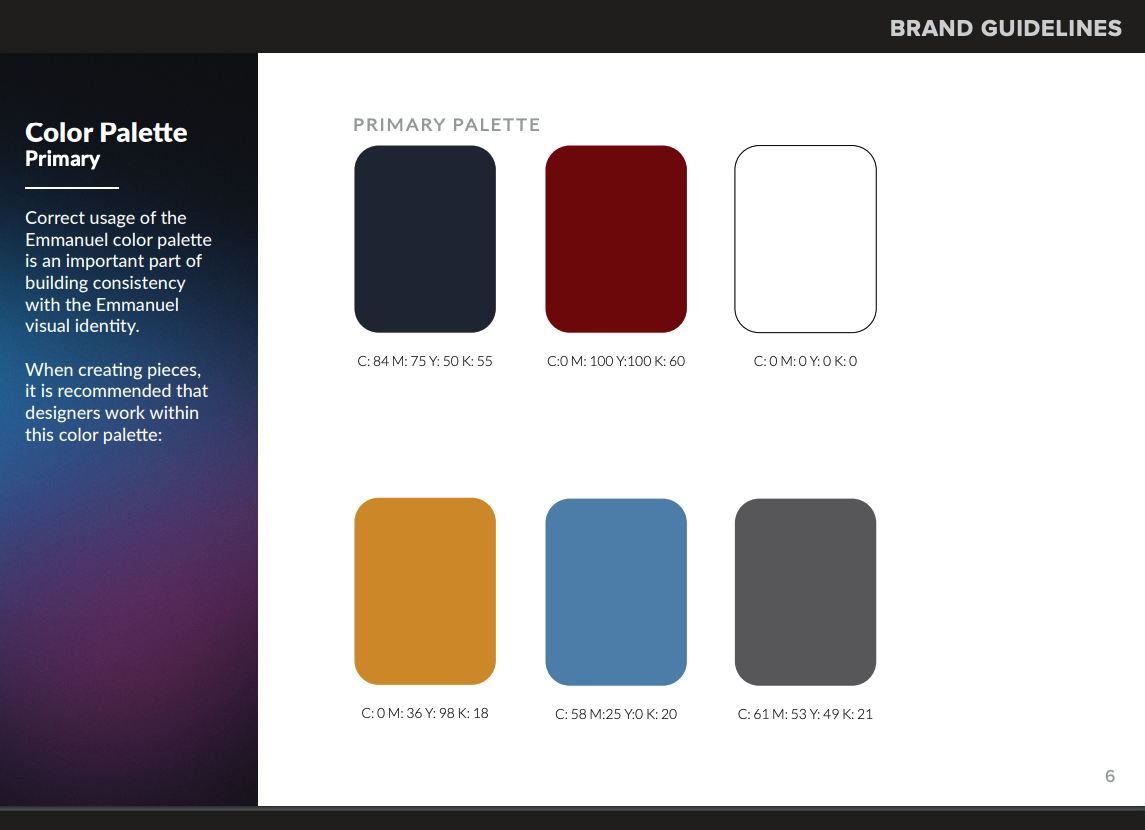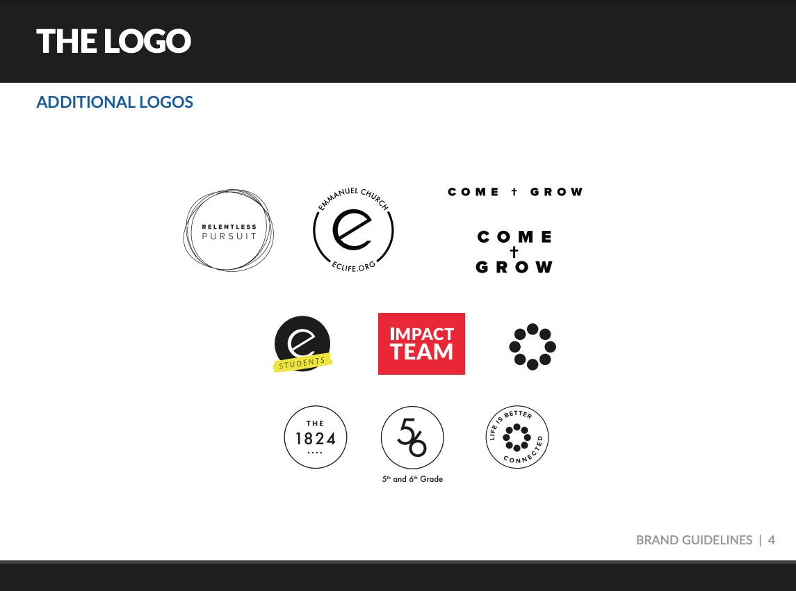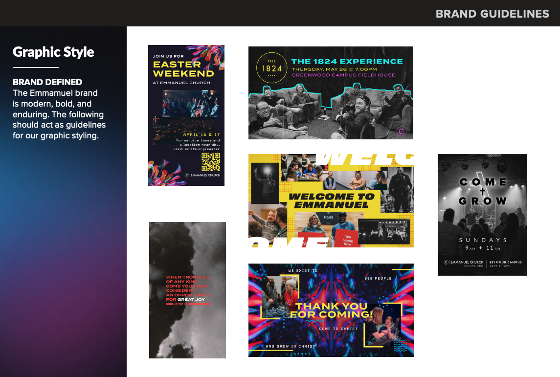 To ensure the visual product was high-quality and consistent, the Clever team developed a new brand guidelines document for the church. This included a guide to logo usage, fonts, color palate, and graphic style with examples. Together Emmanuel and Clever developed a solid foundation for the church’s visual style to be built on into the future.